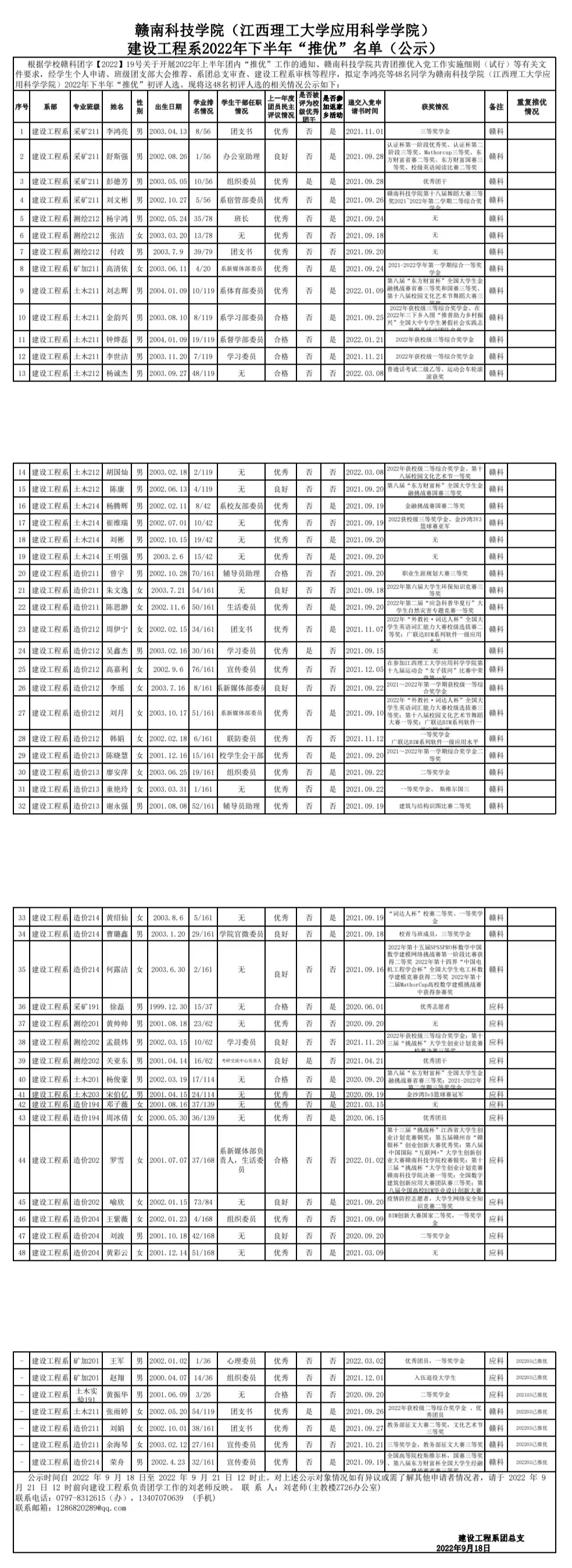 公示时间自2022年9月18日至2022年9月21日12时止。对上述公示对象情况如有异议或需了解其他申请者情况者,请于2022年9月21日12时前向建设工程系负责团学工作的刘老师反映。