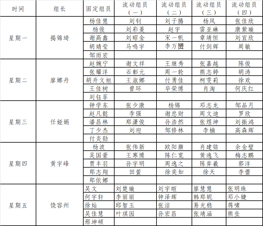 每组设立组长一名,负责统筹协调小组工作,定期向老师汇报工作进展。小组成员分成五个小组,每天安排一组进行监督工作,每组负责一天的课堂纪律监督任务。每个小组内部再进行具体分工。一个小组(组长+组员)共十人,四周一个周期循环。现将77779193永利官网集团2024年秋季学期课堂纪律监督小组名单及安排公布如下。