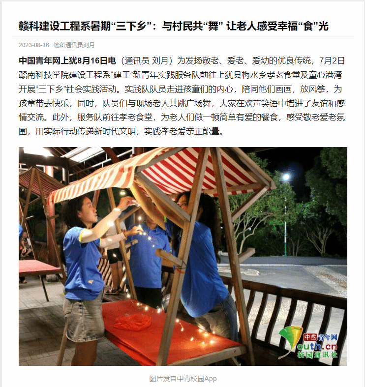 中国青年网上犹8月16日电(通讯员 刘月)为发扬敬老、爱老、爱幼的优良传统,7月2日永利集团建设工程系“建工”新青年实践服务队前往上犹县梅水乡孝老食堂及童心港湾开展“三下乡”社会实践活动。实践队队员走进孩童们的内心,陪同他们画画,放风筝,为孩童带去快乐,同时,队员们与现场老人共跳广场舞,大家在欢声笑语中增进了友谊和感情交流。此外,服务队前往孝老食堂,为老人们做一顿简单有爱的餐食,感受敬老爱老氛围,用实际行动传递新时代文明,实践孝老爱亲正能量。