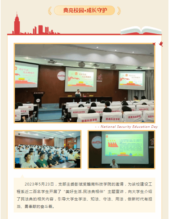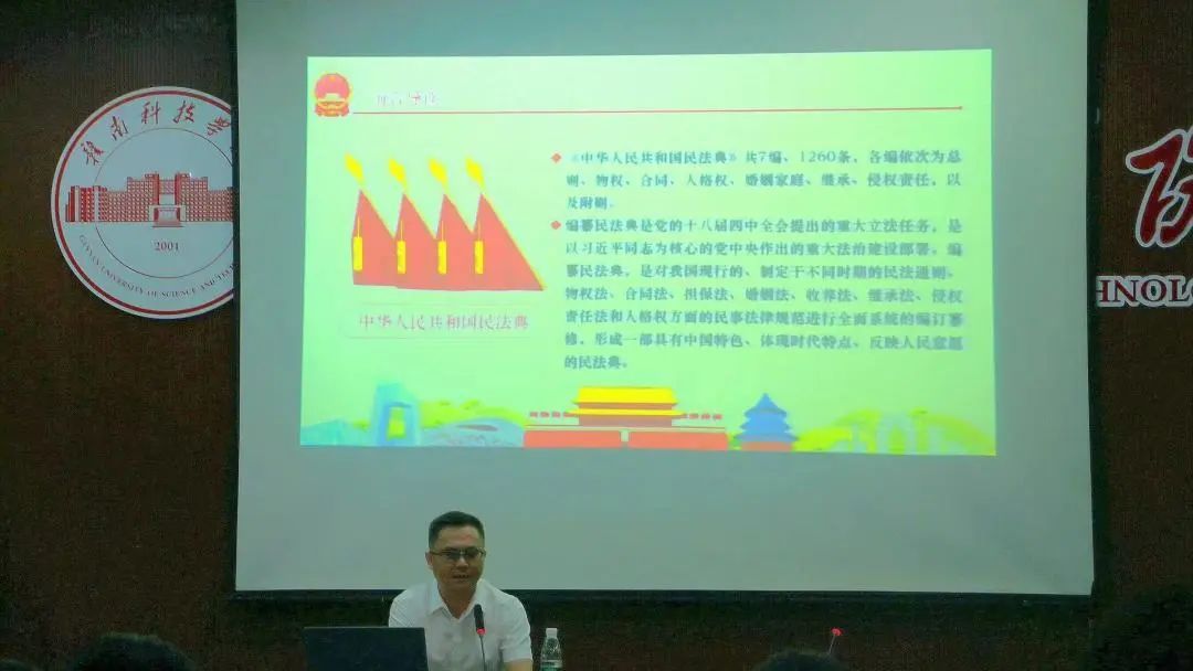 2023年5月23日,支部主委彭斌受永利集团的邀请,为该校建设工程系近二百名学生开展了“美好生活.民法典相伴”主题宣讲,向大学生介绍了民法典的相关内容,引导大学生学法、知法、守法、用法,做新时代有担当、勇奉献的奋斗着。