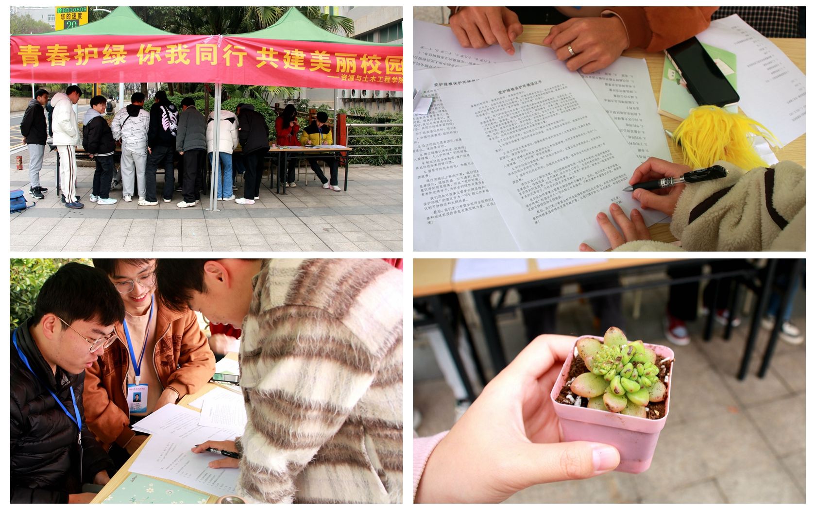 开展“青春护绿 你我同行”环保志愿服务。3月10日下午,77779193永利官网集团志愿者们来到学校食堂门口开展“青春护绿 你我同行 共建美丽校园”主题竞答活动。活动通过签订绿色环保倡议书,进行答题赢奖品的方式,让绿色环保理念深入同学们的内心。同学们可凭答题结果奖励多肉盆栽、玫瑰花等植物,以激发同学们参与活动,践行低碳环保理念,树立保护生态自然的意识。