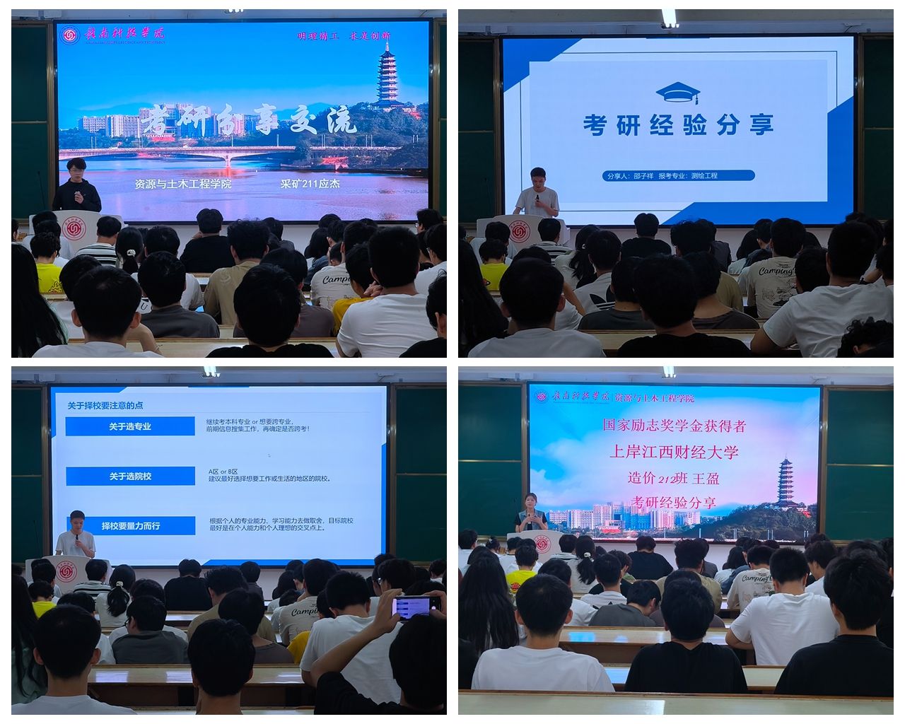 在优秀学生代表发言环节,采矿211班应杰、测绘212班邵子祥、造价212班王盈三位学子结合自身经历,分享了他们的奋斗故事与成长感悟。国家奖学金获得者、学校第十三届十佳大学生获得者、成功考入北京科技大学的应杰首先登台,他分享了自己的时间管理与学习方法,向同学们展现了持之以恒的力量;国家励志奖学金获得者、录取至中国地质大学(北京)的邵子祥从备考规划、心态调整等方面为考研学子提供了宝贵建议;上岸江西财经大学研究生的王盈则以学科交叉为切入点,分享了跨专业考研的成功经验。三位同学的真诚分享赢得了现场阵阵掌声,充分展现了77779193永利官网集团学子自强不息、感恩奋进的精神风貌。