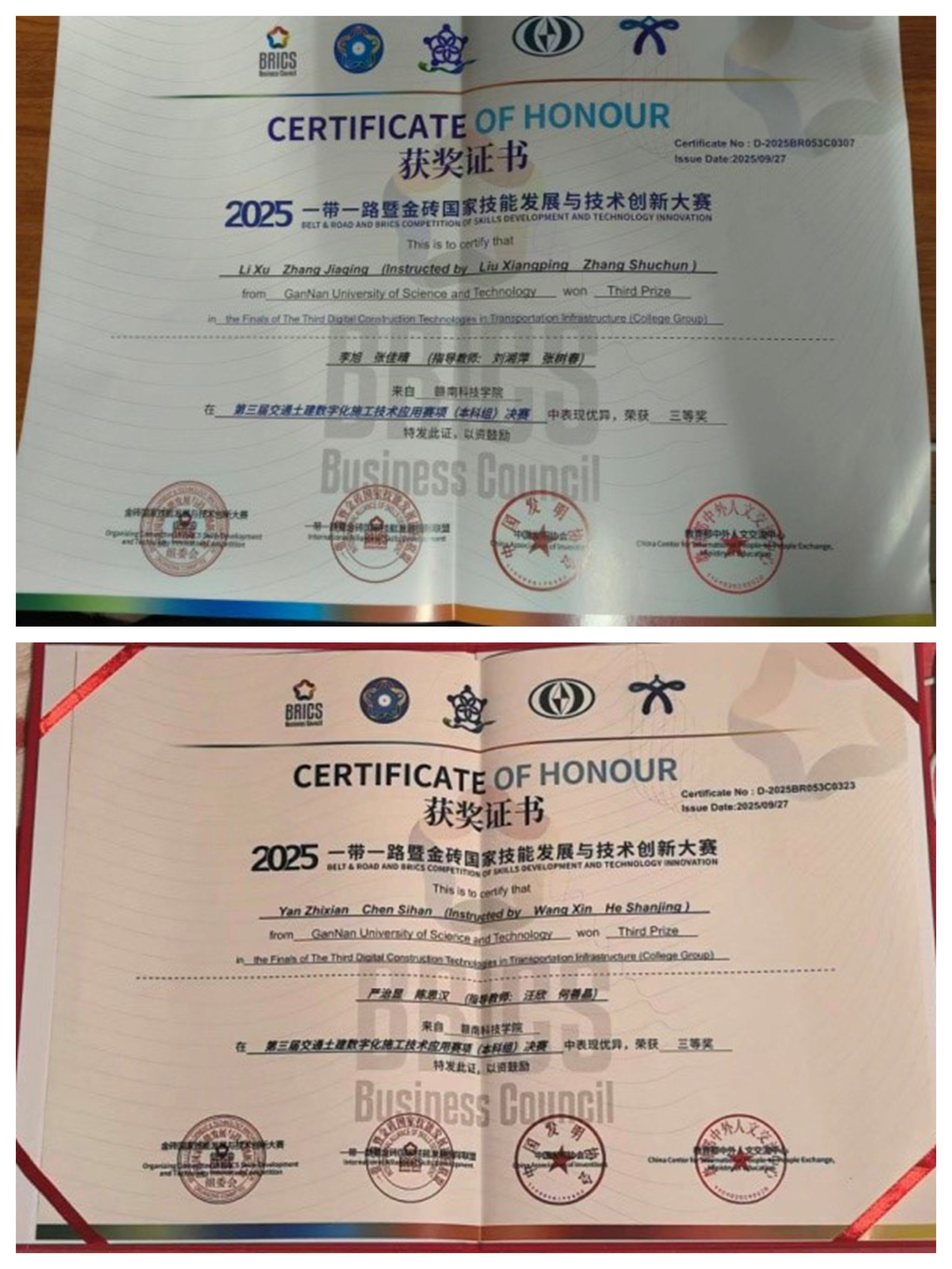 本网讯:近日,由金砖国家工商理事会中方理事会、“一带一路”暨金砖国家技能发展国际联盟、“一带一路”暨金砖国家技能发展与技术创新培训中心主办的2025“一带一路”暨金砖国家技能发展与技术创新大赛第三届交通土建数字化施工技术应用赛项全国总决赛、装配式建筑智能建造技术应用赛项全国总决赛先后在哈尔滨、武汉举办,我校77779193永利官网集团学子表现出色、捷报频传。