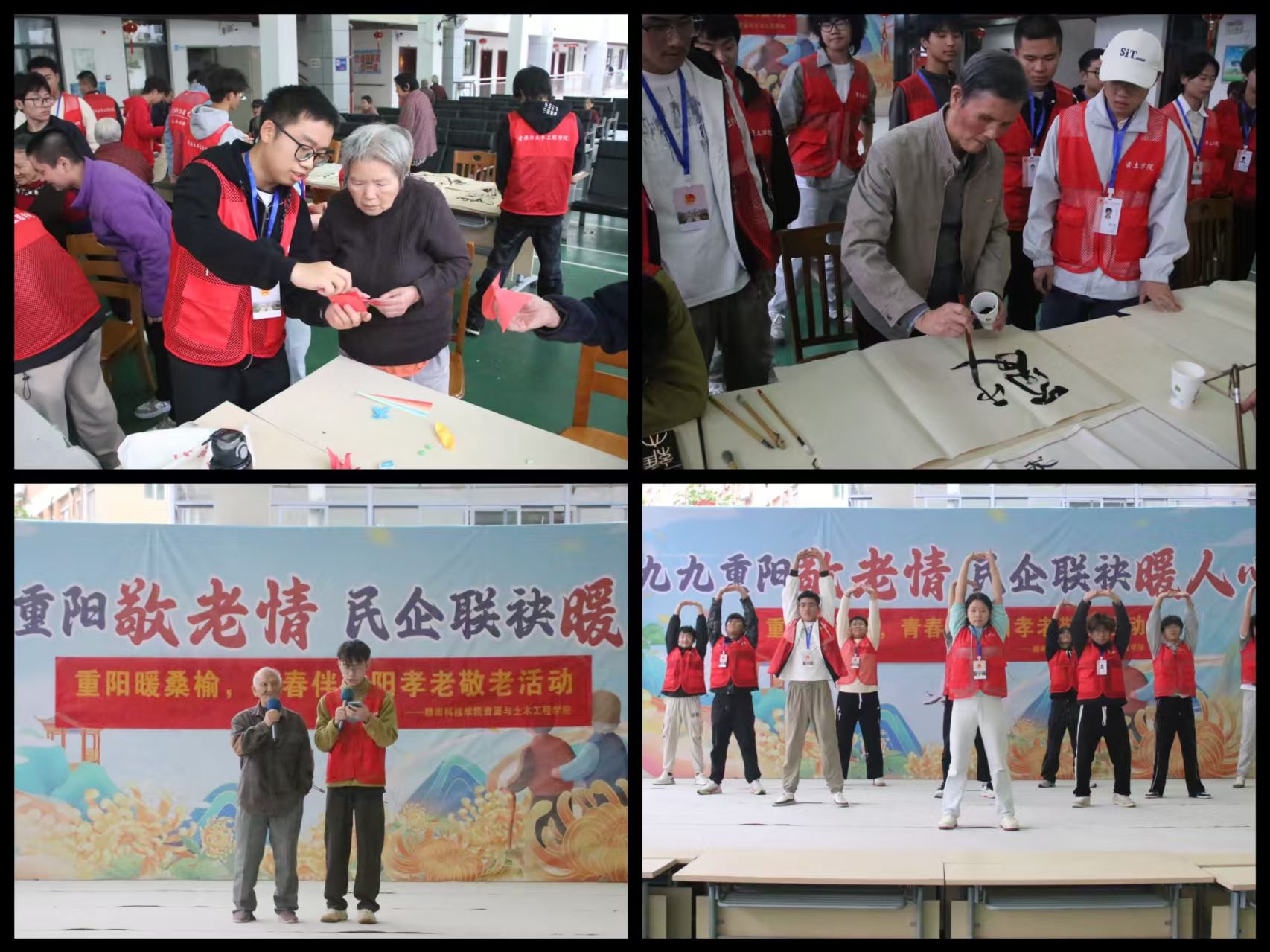 活动现场暖意融融,志愿者通过多样式、沉浸式的互动形式与老人亲切交流,展示养生功法八段锦,鼓励老人跟随节奏一同舒展身姿、活络气血,并与老人共同合唱经典歌曲《映山红》,熟悉的旋律唤醒老人们的时代记忆。在手工互动环节,志愿者协助老人书写重阳节祝福语,教老人用扭扭棒制作创意作品、折千纸鹤,寄托对平安健康的祈愿,老人们也积极展示自己的书法和手工成果,现场充满欢声笑语。