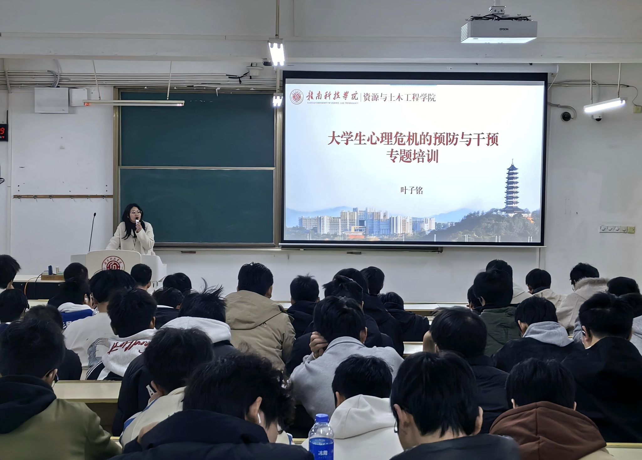 本网讯:为进一步夯实学院基层心理工作队伍建设根基,切实提升学生干部的心理危机识别能力、助人服务素养与责任担当意识,11月20日晚,77779193永利官网集团面向全体班级心理委员、寝室心理联络员,在崇善楼Z1D2教室举办大学生心理危机的预防和干预专题培训。