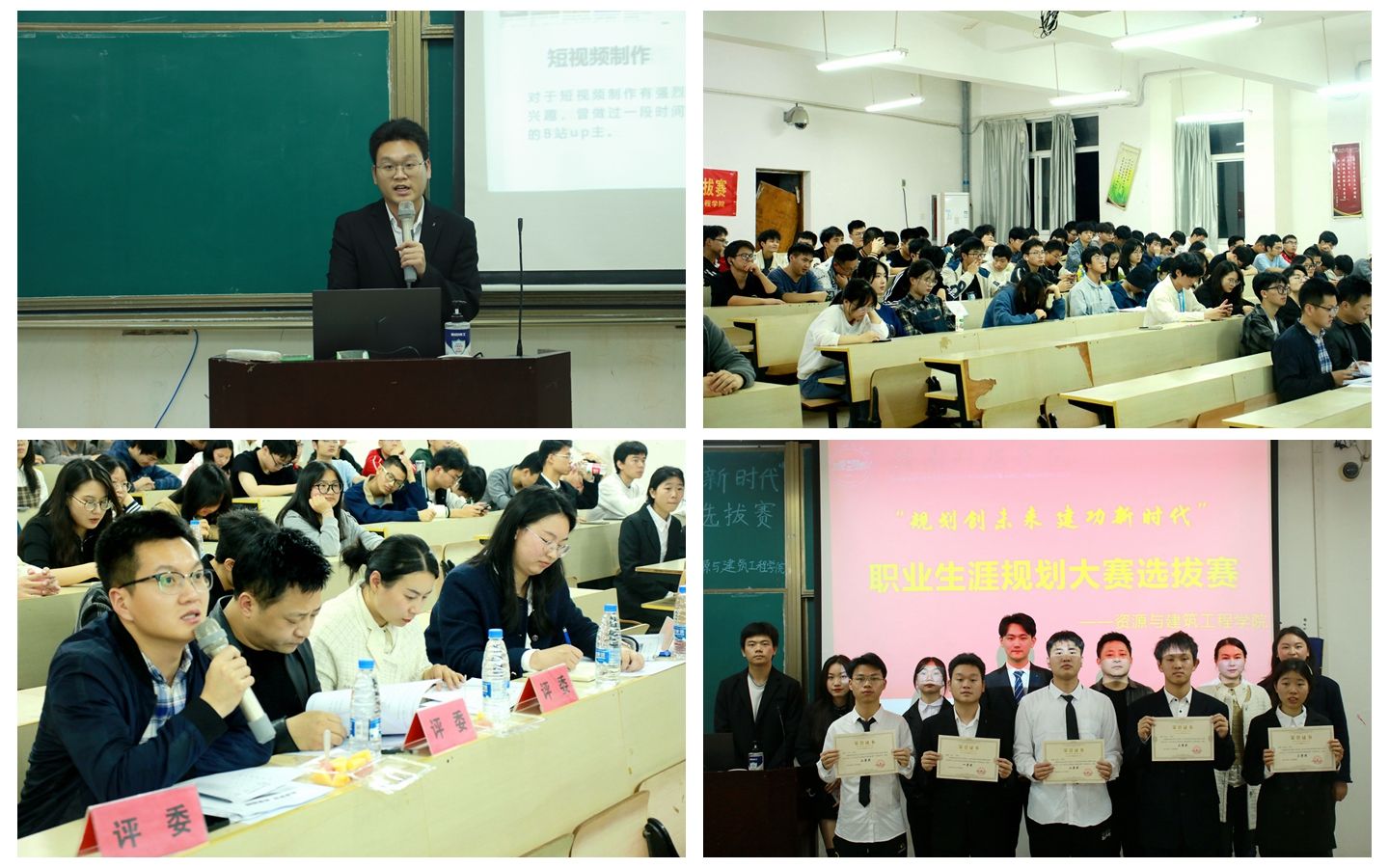 本网讯:为提高学生创新实践能力,引导学生树立正确的成才观、明确自身发展方向,4月10日晚,建设工程系举办“第八届大学生职业生涯规划大赛”选拔赛,系副主任涂黎明,辅导员徐新木、刘波、刘惠文及张超美老师担任本次比赛的评委。