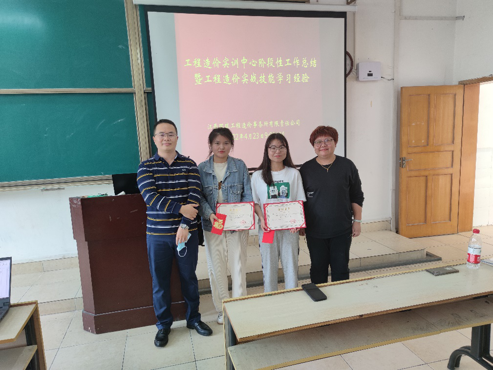 工程造价实训中心企方负责人江西环球造价事务所有限公司赣州分公司法人龙其芳总经理给学习成绩优秀的学生代表徐卿和付蓉两位同学颁发奖状和奖学金,她充分表达了实训中心对他们取得成绩的肯定,并鼓励她们带动身边的同学一起营造良好的学习氛围,从而取得更大的成绩。