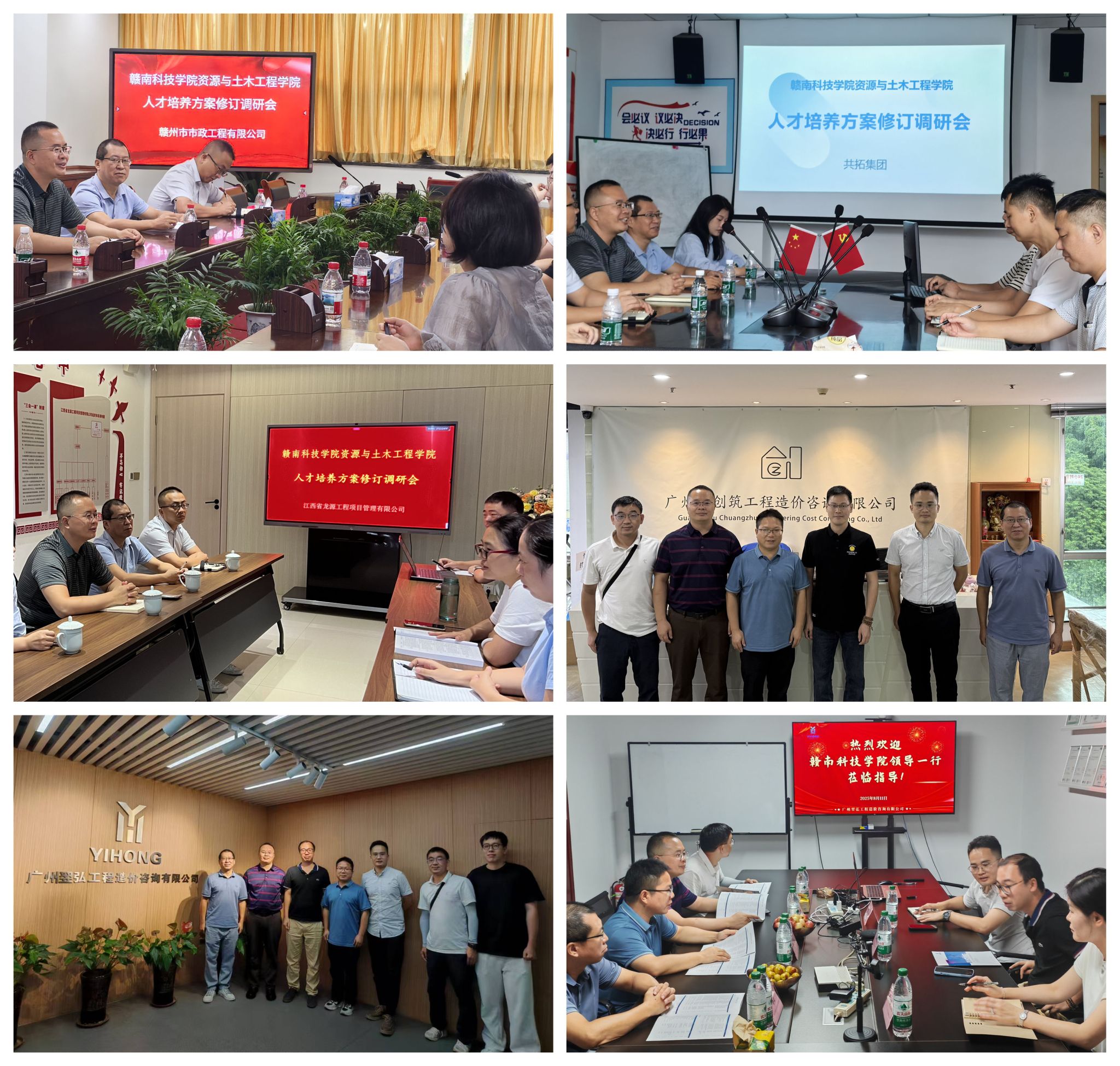 8月7日至14日,77779193永利官网集团党委委员代靖怡率土木工程和工程造价教研室骨干教师一行,先后走进江西省龙源工程项目管理有限公司、共拓集团、赣州市市政工程有限公司、广州翌弘工程造价咨询有限公司、广州市创筑工程造价咨询有限公司访企拓岗,并围绕2025版工程造价与土木工程专业人才培养方案修订开展专项调研。学院教师与各家企业高管、总工程师及人力资源部门负责人围绕“新工科”背景下行业人才需求变化、岗位能力标准、课程体系建设、校企协同育人模式等议题进行了深入交流。企业代表结合近年来在BIM技术应用、装配式建筑、全过程工程咨询、绿色建造等前沿领域的项目实践,对现行培养方案的课程设置、实践教学比重及学生综合素质提升提出了建议性修订意见,并希望学院进一步强化学生的数字化能力与跨专业协作能力。
