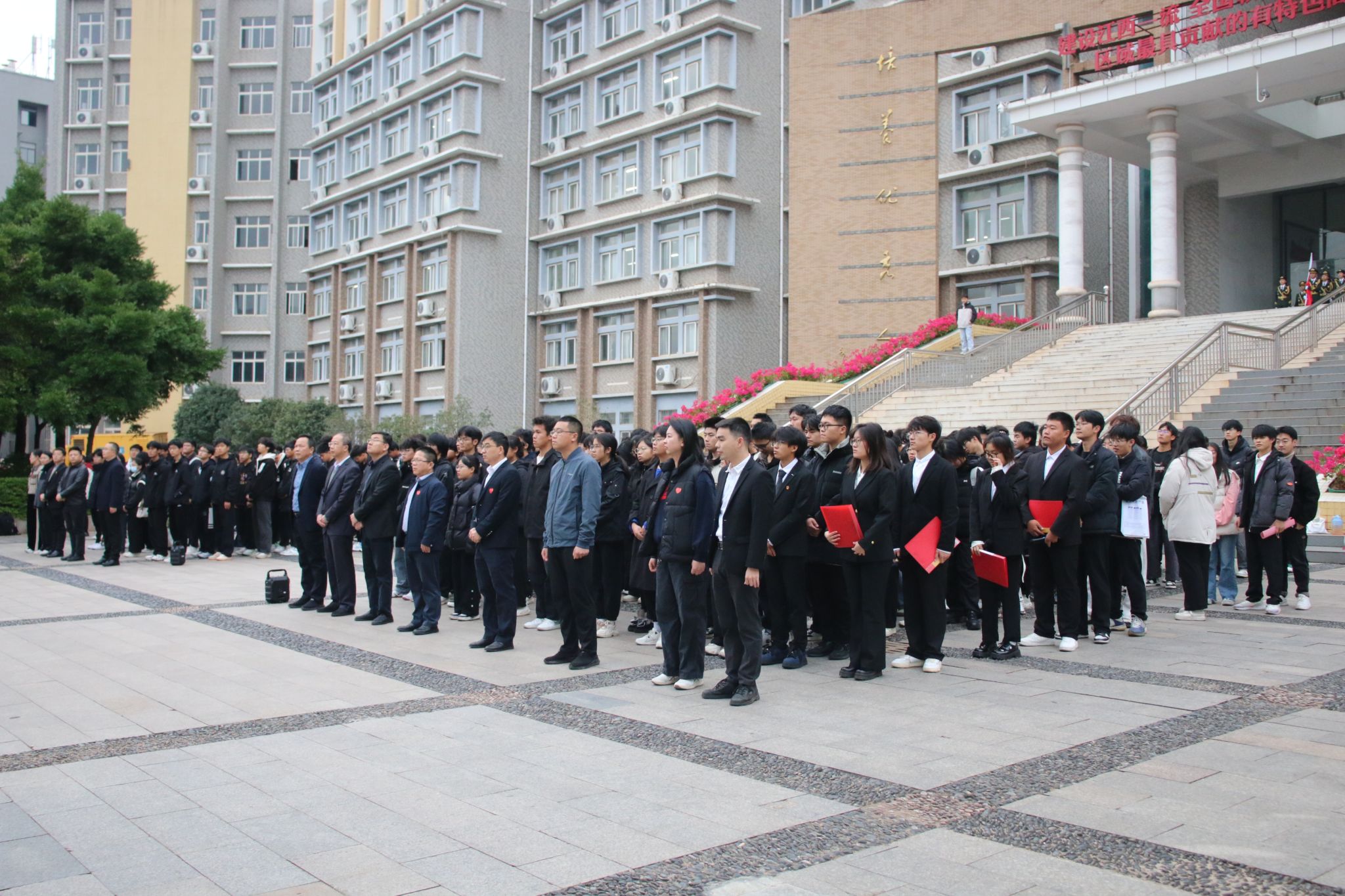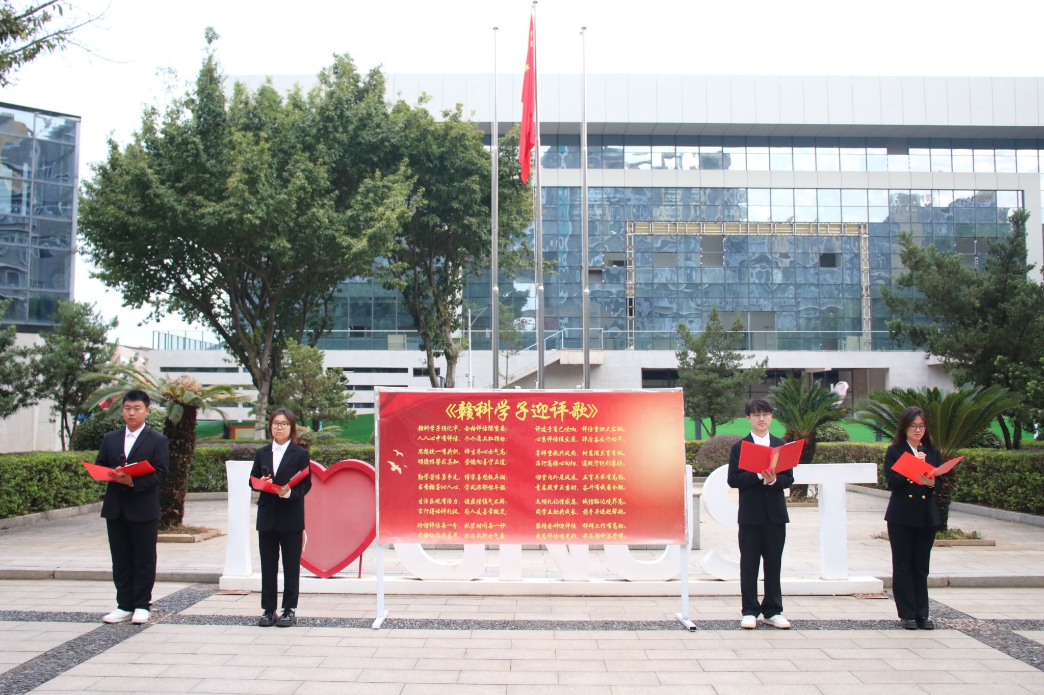 学生代表工程造价241班郑玉洁开展作“喜迎学校党代会,做拼搏贡献的赣科青年”为主题的国旗下演讲。她倡议77779193永利官网集团学子应携手共进为学校合格评估添砖加瓦,围绕学校中心工作,服务大局,在学习生活、学科竞赛、志愿服务等方面贡献青春力量,献礼学校即将召开的第一次党代会,以更加饱满的热情、坚定的信心、扎实的行动争做拼搏奉献的新时代赣科青年。学生代表工程造价242班孙贺淇、工程造价242班谌业兴、工程造价242班刘思彤和土木工程241班徐奇翔共同领唱《赣科学子迎评歌》,全体师生齐声跟唱,此次升旗仪式在歌唱中圆满结束。