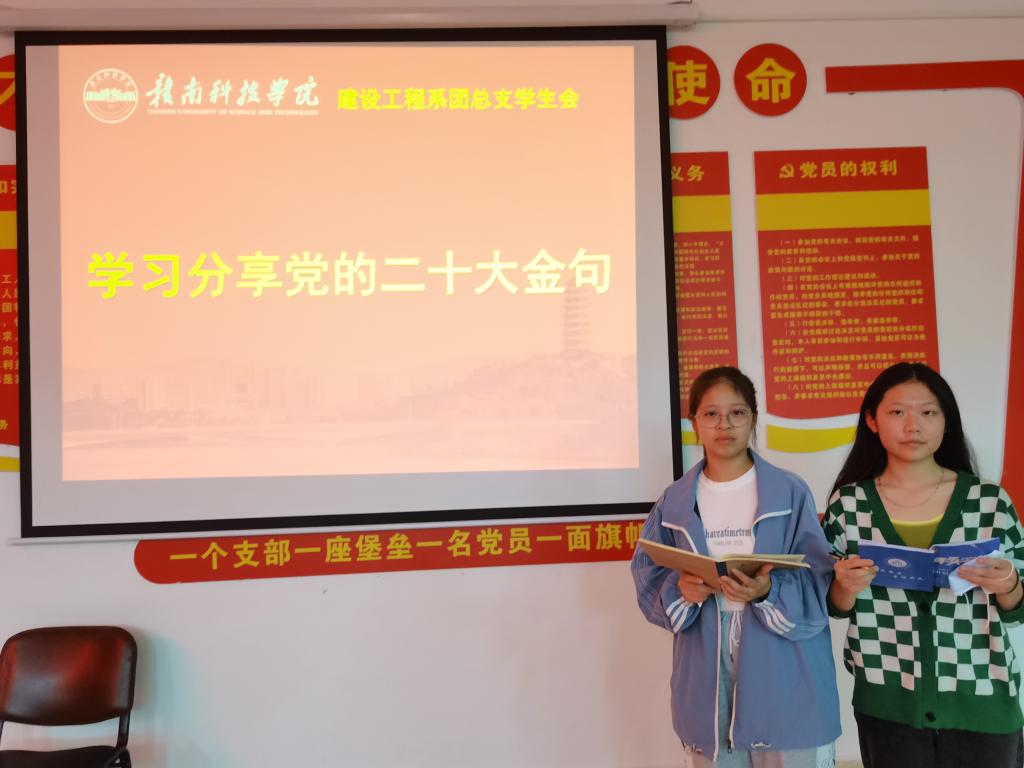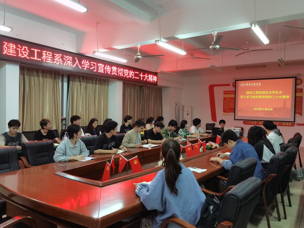 师生共同学习党的二十大。建设工程系团总支学生会召开学习党的二十大精神会议,组织观看二十大相关视频并学习分享对党的二十大金句理解,进一步加强同学们对二十大的了解。