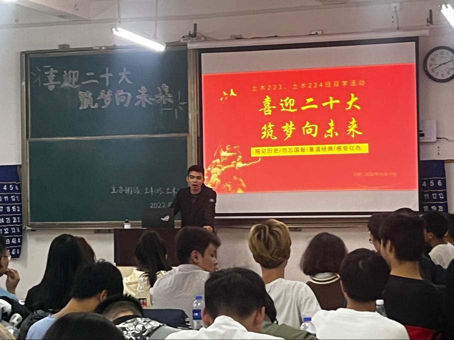 喜迎二十大双学活动。各班级组织同学举办以“喜迎二十大,筑梦向未来”为主题的双学活动。在现场,大家以多种表演形式充分展现了新时代青年的青春与活力,表达了大家的爱国情怀。