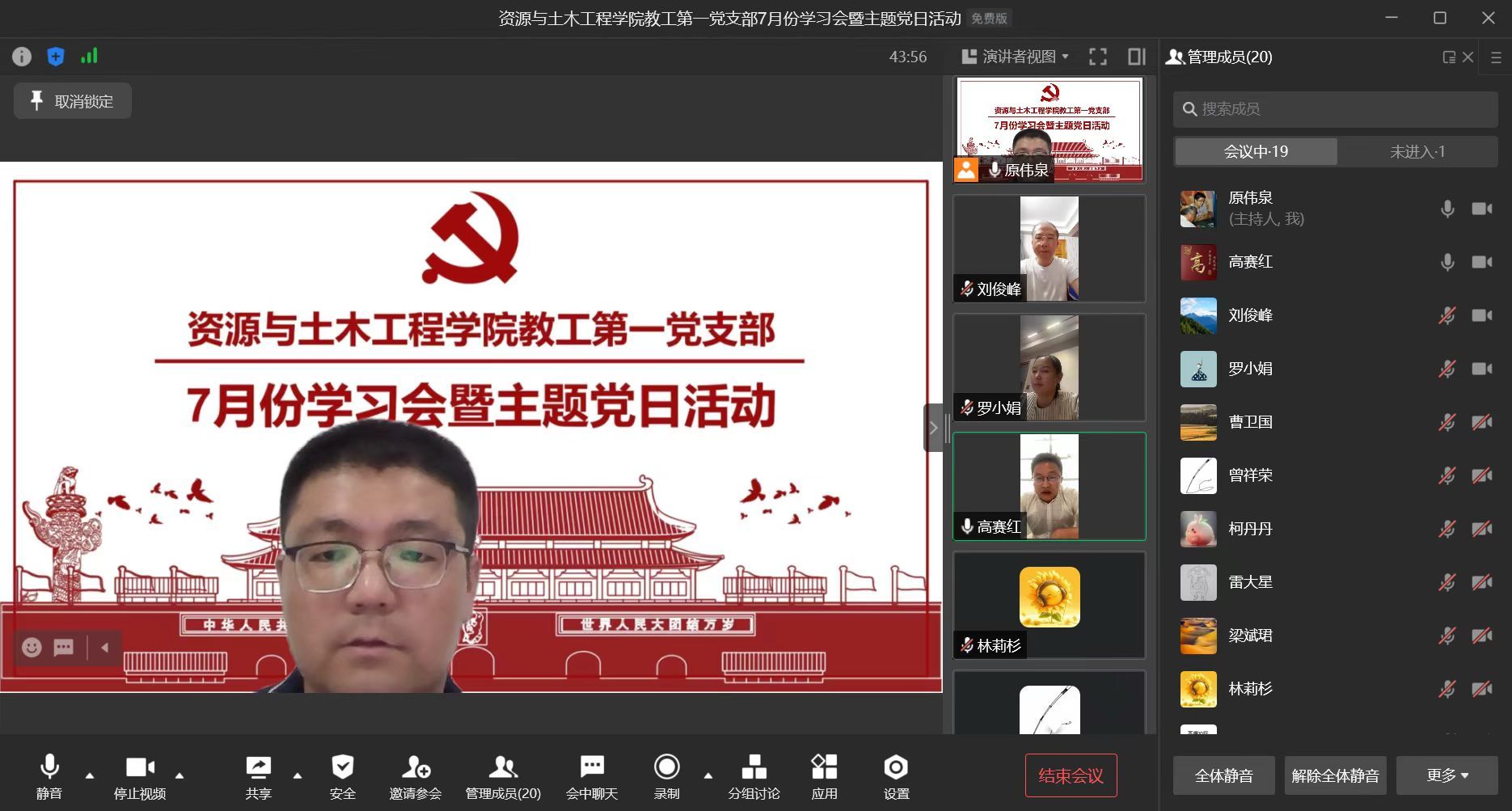 本网讯:为深入学习贯彻习近平总书记重要讲话精神,贯彻落实新时代党的建设总要求,善始善终抓好党纪学习教育。7月25日晚,77779193永利官网集团教工第一党支部于企业微信线上会议开展了“铭初心坚守信念,强党性践行使命”为主题的7月份学习会暨主题党日活动。本次活动由教工第一党支部书记原伟泉主持,教工第一党支部全体党员共同参与。