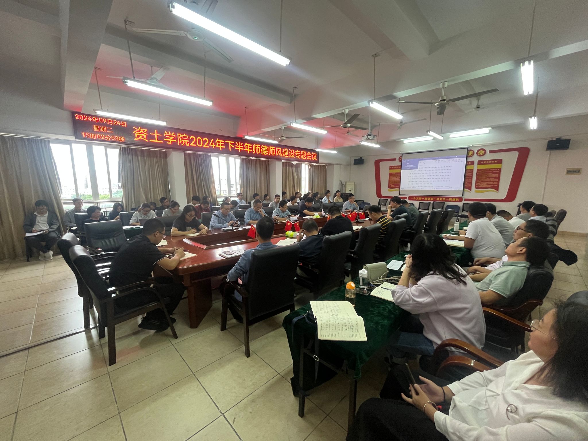会上,卢志刚领学了习近平总书记在全国教育大会上的重要讲话、代靖怡领学了《中华人民共和国教师法》第二章教师权利与义务的内容以及学校组织人事部下发的《关于2024年下半年师德师风建设工作提示》文件精神、涂黎明传达了学校下发的《关于规范教职工着装与仪容仪表的通知》文件精神,原伟泉、郭孝翀两位博士结合师德师风主题和工作实际作交流发言。