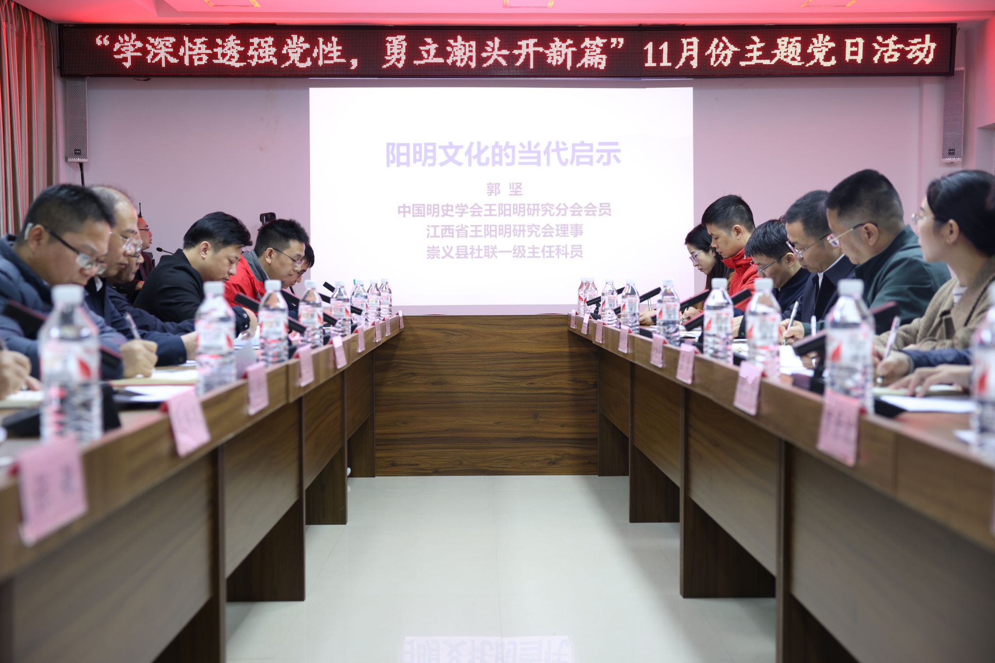 活动现场,在讲解员的带领下,全体党员们先后参观崇义县阳明博物馆和赣南三整暨崇义革命历史陈列馆,并进行现场参观教学。中国明史学会王阳明研究分会会员、江西省王阳明研究会理事、崇义县社联郭坚主任以“阳明文化的当代启示”为题,为全体党员讲授一堂微讲座。他深入浅出的讲解阳明文化的发展脉络,并阐述把马克思主义基本原理同中国具体实际相结合、同中华优秀传统文化相结合,是立足中国特色社会主义的伟大实践,“两个结合”吸纳了包括阳明学在内的中华民族文化养分,对优秀传统文化进行了创造性转化与创新性发展。参观学习后,全体党员深刻感受阳明文化的历史内涵和时代价值,深入了解了“赣南三整” 中整顿、整编、整训的关键意义,进一步锤炼了党性修养,增强了纪律意识。