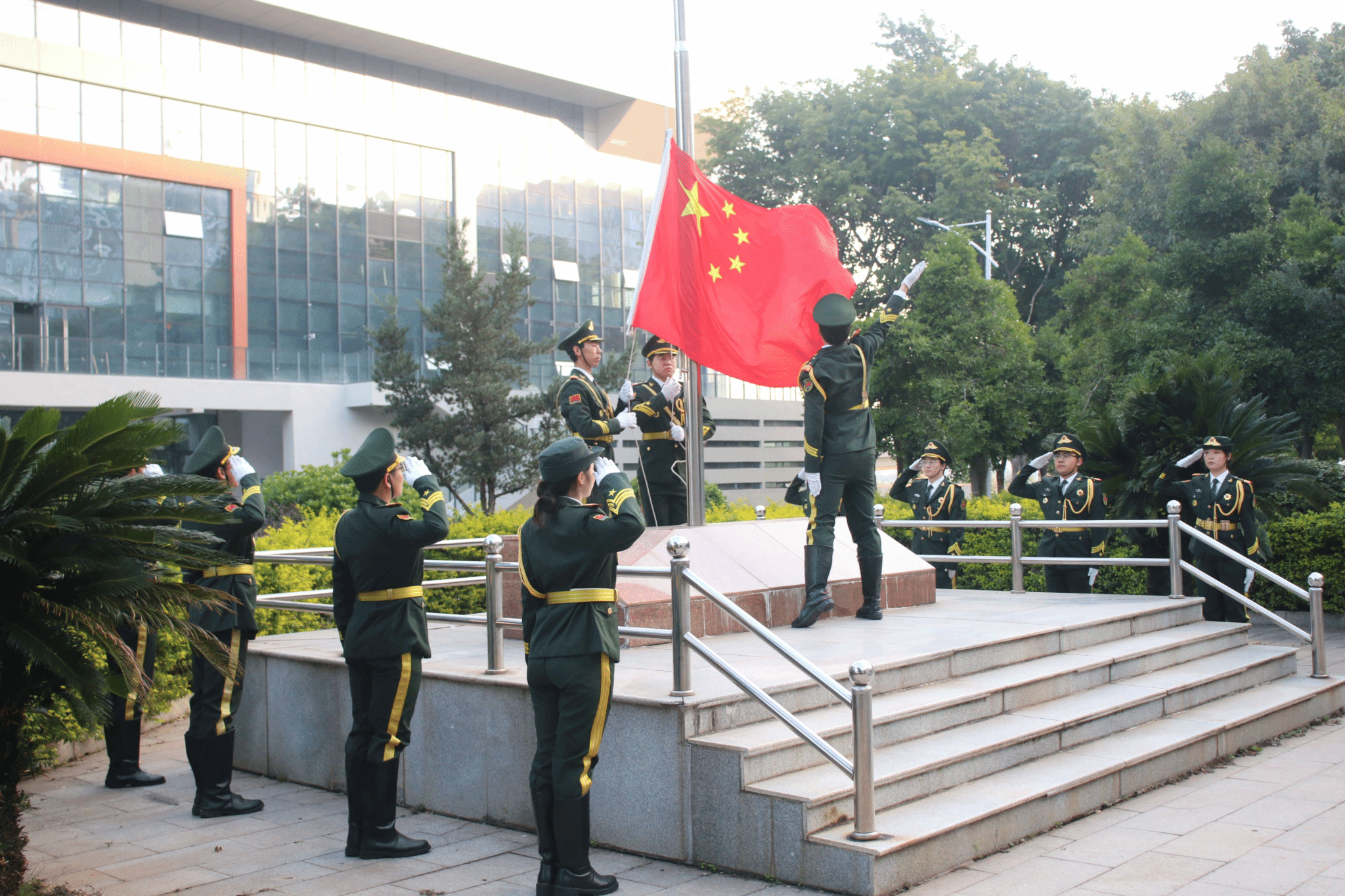 升旗仪式在庄严肃穆、振奋人心的氛围中开始,国旗护卫队迈着铿锵有力的步伐,护送国旗入场。随着激昂的《义勇军进行曲》响起,全体师生行注目礼,奏唱国歌。