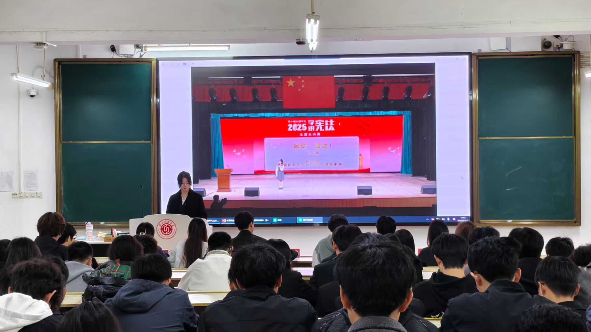 活动在主教Z1D1设立主会场组织集中观看,各班级同步在教室联动收看,同时鼓励学生通过全国网络直播平台自主参与学习,实现法制教育全覆盖。观看现场秩序井然,气氛庄重。师生们认真聆听、专心记录,深刻感受着宪法作为国家根本大法的权威与力量。活动中,师生深入学习领会“坚持党的全面领导、人民当家作主、依法治国有机统一”的宪法原则,充分认识到“两个确立”对新时代我国社会主义民主法治建设的决定性意义,不断提升贯彻实施宪法的思想自觉与行动自觉。直播结束后,同学们纷纷表示,通过“宪法晨读”活动,对宪法确立的国家根本制度、根本任务和公民的基本权利义务有更清晰的认识,进一步理解宪法精神与个人成长、社会发展的紧密联系。