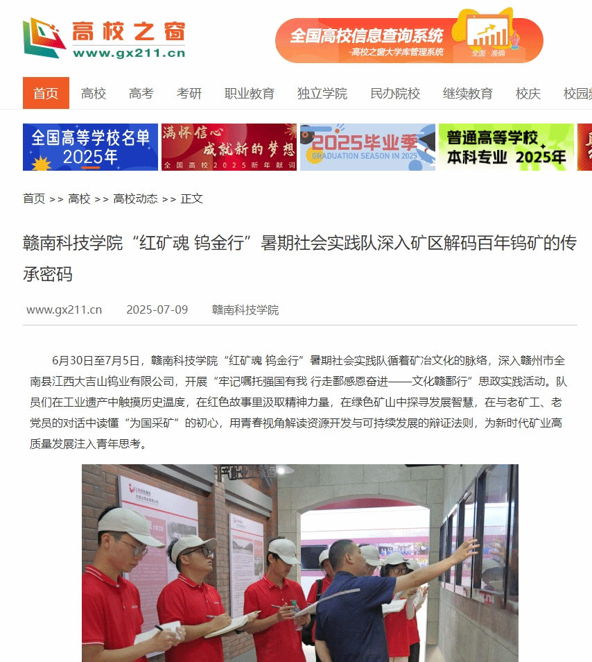 6月30日至7月5日,永利集团“红矿魂 钨金行”暑期社会实践队循着矿冶文化的脉络,深入赣州市全南县江西大吉山钨业有限公司,开展“牢记嘱托强国有我 行走鄱感恩奋进——文化赣鄱行”思政实践活动。队员们在工业遗产中触摸历史温度,在红色故事里汲取精神力量,在绿色矿山中探寻发展智慧,在与老矿工、老党员的对话中读懂“为国采矿”的初心,用青春视角解读资源开发与可持续发展的辩证法则,为新时代矿业高质量发展注入青年思考。