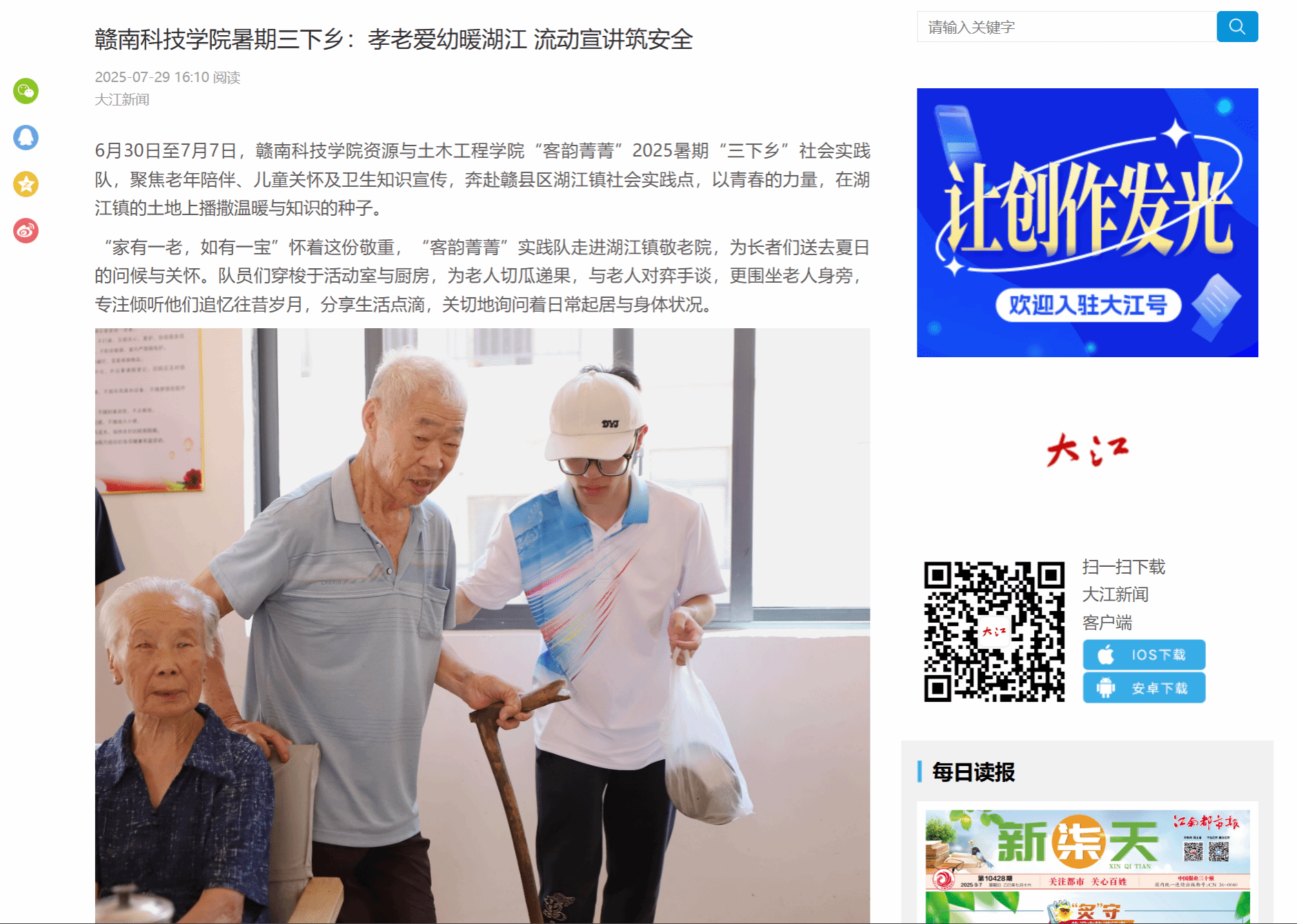 6月30日至7月7日,77779193永利官网集团“客韵菁菁”2025暑期“三下乡”社会实践队,聚焦老年陪伴、儿童关怀及卫生知识宣传,奔赴赣县区湖江镇社会实践点,以青春的力量,在湖江镇的土地上播撒温暖与知识的种子。