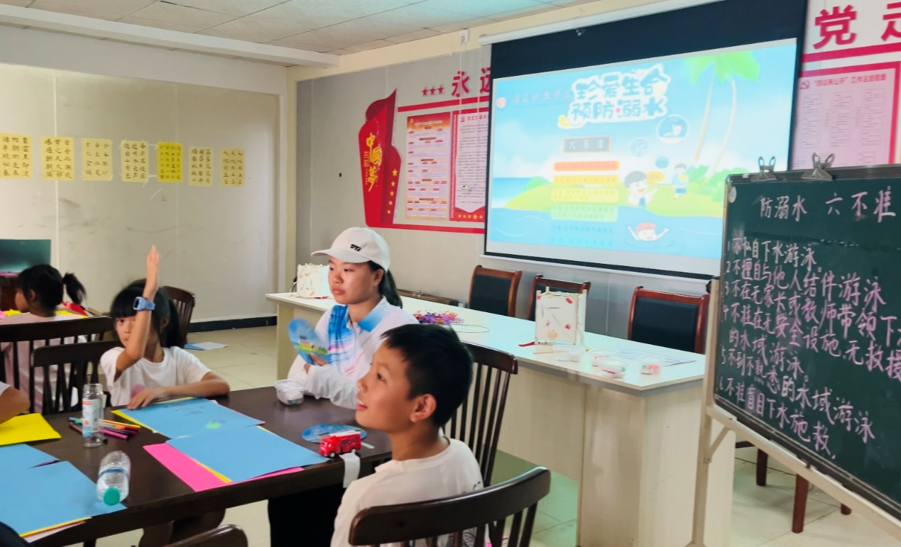 成员巧妙将安全教育动画片融入其中,宣讲防溺水、教育普法、推广普通话等知识。当问到“防溺水六不准”时,孩子们齐刷刷举手,清脆的童声接力背出,认真的模样格外动人。这份陪伴里,既有尽情玩耍的欢乐,也有安全守护的用心——呵护童心,既要让他们绽放笑颜,更要为成长系好安全的纽扣。