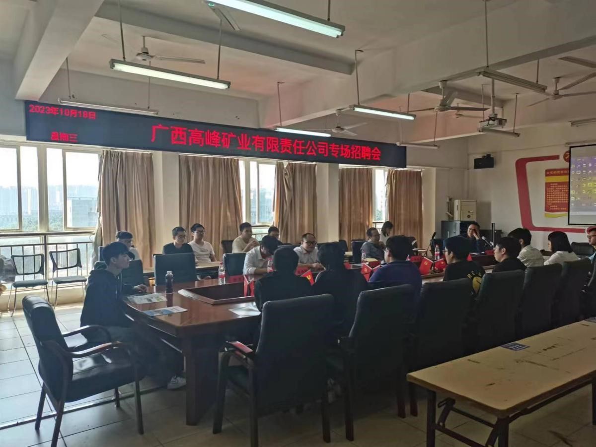 本网讯:为全面深化校企合作,加强供需精准对接,促进毕业生更加充分、更高质量就业创业。10月18日,广西高峰矿业有限责任公司副总经理、我校06级采矿优秀校友周立一行四人应邀来到我校,在崇善楼Z713举办专场招聘会。建工系班子成员卢志刚、涂黎明、代靖怡,就业辅导员刘波及2024届采矿、选矿专业毕业生参加了此次招聘会。