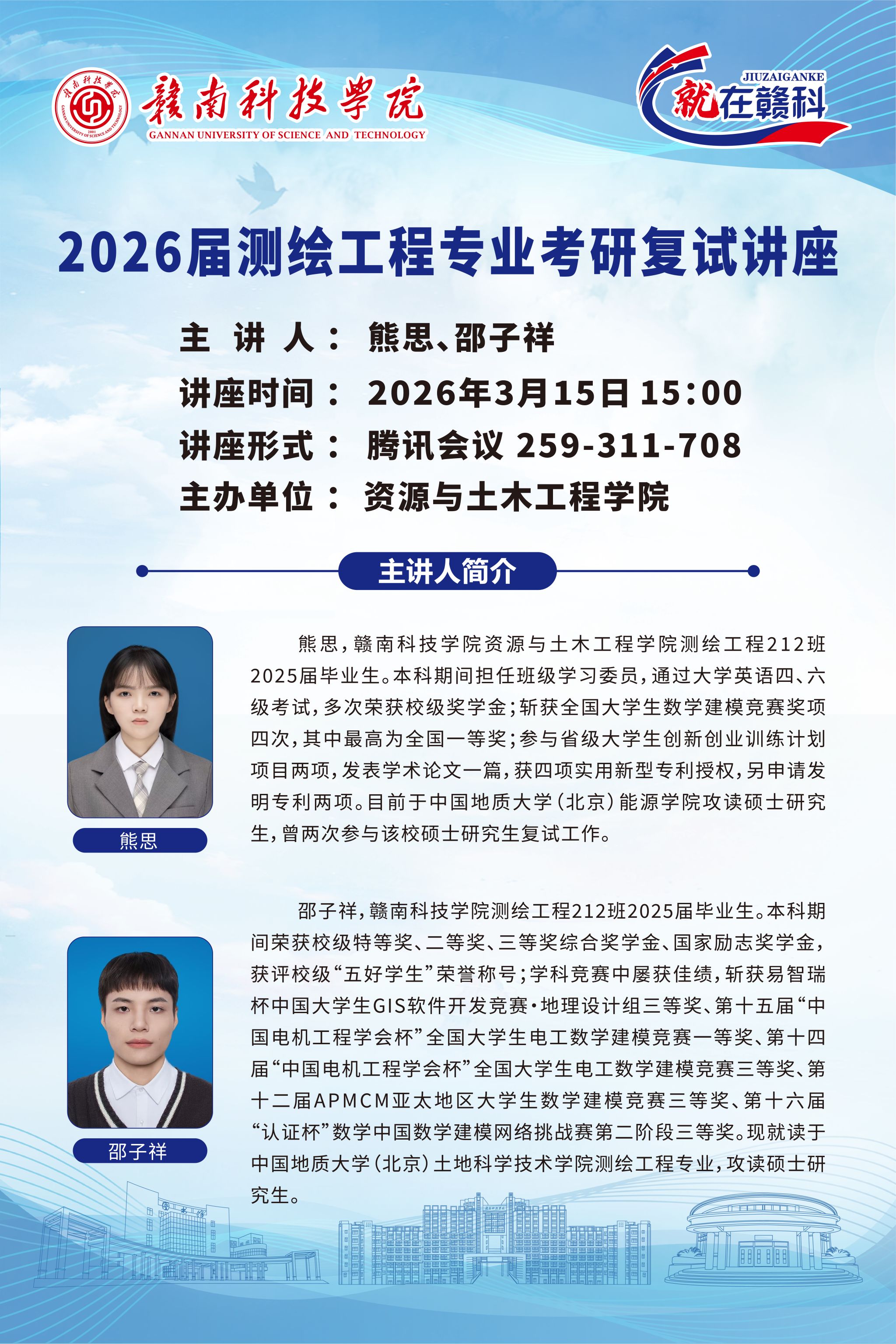 讲座中,两位学长结合自身在中国地质大学(北京)的读研经历与复试工作经验,围绕复试流程、专业知识考核、综合面试技巧、调剂注意事项等核心内容展开细致讲解。熊思学长重点分享了复试材料准备、导师联系技巧及专业面试应答思路,邵子祥学长则针对测绘工程专业特色,梳理了专业知识复习重点与实践能力考核要点,同时结合自身竞赛与科研经历,为同学们提供了个性化备考建议。