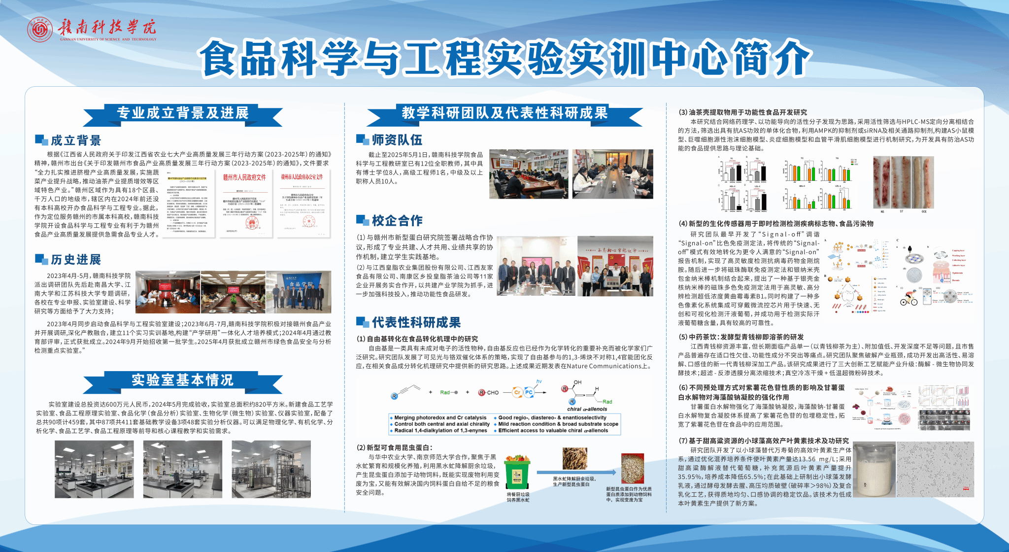 截止至2025年5月1日,永利集团食品科学与工程教研室已有12位全职教师,全部具有硕士及以上学位,其中具有博士学位8人,占比达75%,高级工程师1名,中级及以上职称人员10人。与赣州市新型蛋白研究院等科研院所、企业签署合作协议,形成了专业共建、人才共用、业绩共享的协作机制,建立学生实践基地。食品科学与工程专业强调理论与实践相结合,学生将在实验室中进行各种食品加工、分析和检测实验,同时还有机会参与实习项目,接触真实的食品生产环境,获得宝贵的工作经验。2025年4月食品科学与工程专业实验室已获批成为赣州市绿色食品安全与分析检测重点实验室,将积极在人才培养、产学研合作等方面发挥作用。