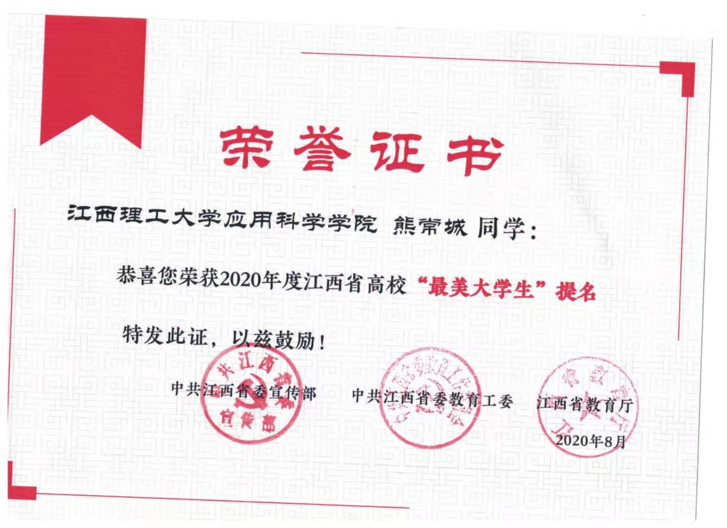 近日,我院建设工程系造价174班熊常城同学收获一份2020年度江西省高校“最美大学生”提名获奖证书。