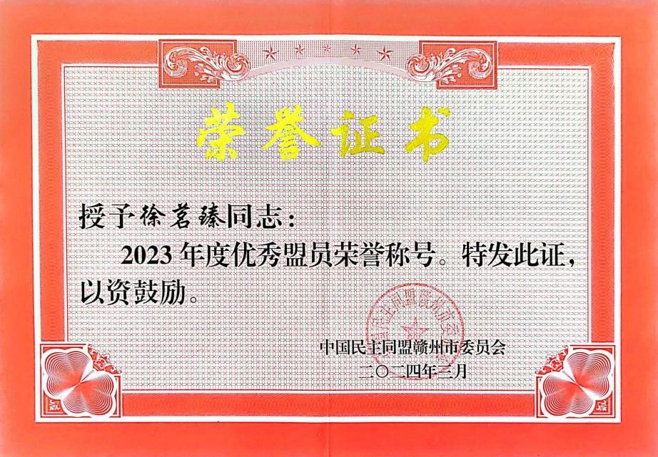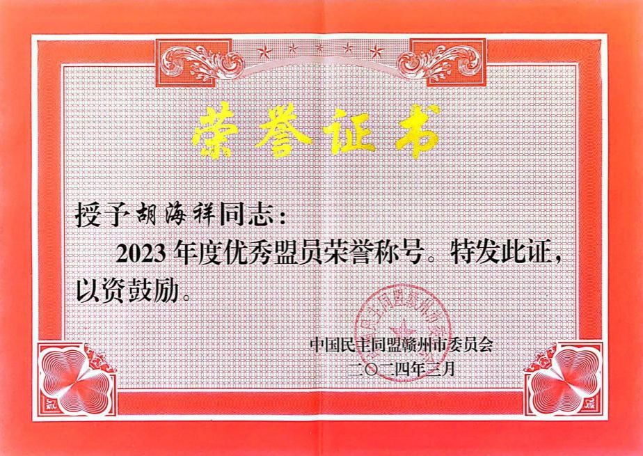 本网讯:3月29日,民盟赣州市委会召开五届七次全委(扩大)会议,会议对2023年度表现突出的全市先进集体、先进个人进行了表彰,我校盟员胡海祥、徐茗臻、谢丽琴获得“优秀盟员”称号。